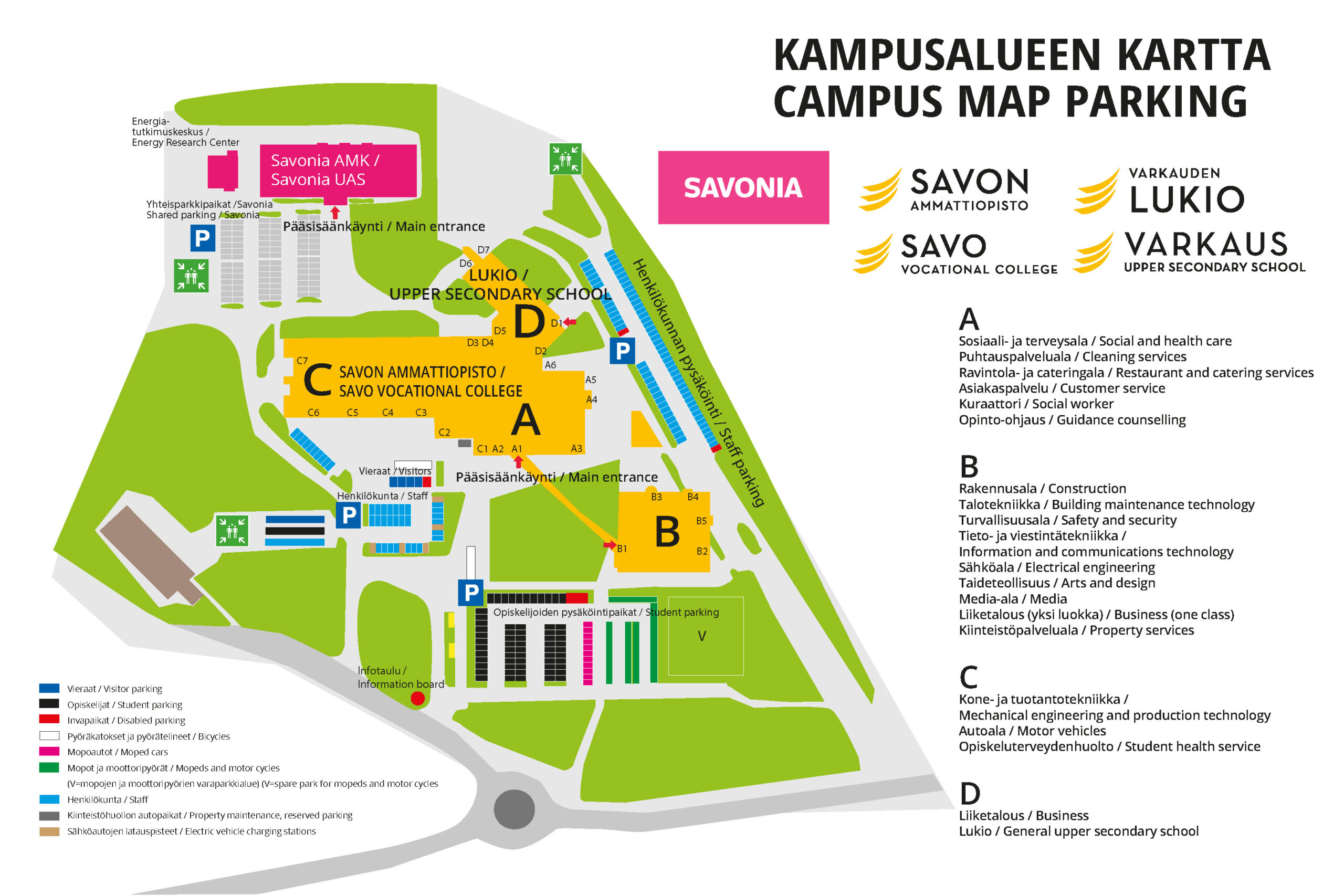 Parking:Parking spaces for visitors are primarily available in the Sakky parking area (see area map). Cars can be parked freely in all legally permitted parking spaces. Additional parking is available at the Savonia University of Applied Sciences parking area (behind the Savon Vocational College buildings), along Osmajoentie, or at Varkauden liikuntatalo.